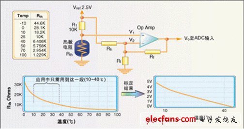 熱敏電阻消耗的能量對溫度的影響用耗散常數(shù)來表示,它指將熱敏電阻溫度提高比環(huán)境溫度高1℃所需要的毫瓦數(shù)。耗散常數(shù)因熱敏電阻的封裝、管腳規(guī)格、包封材料及其它因素不同而不一樣?! ?br /> 系統(tǒng)所允許的自熱量及限流電阻大小由測量精度決定,測量精度為±5℃的測量系統(tǒng)比精度為±1℃測量系統(tǒng)可承受的熱敏電阻自熱要大?! ?br /> 應(yīng)注意拉升電阻的阻值必須進行計算,以限定整個測量溫度范圍內(nèi)的自熱功耗。給定出電阻值以后,由于熱敏電阻阻值變化,耗散功率在不同溫度下也有所不同?! ?br /> 有時需要對熱敏電阻的輸入進行標(biāo)定以便得到合適的溫度分辨率,圖3是一個將10~40℃溫度范圍擴展到ADC整個0~5V輸入?yún)^(qū)間的電路。