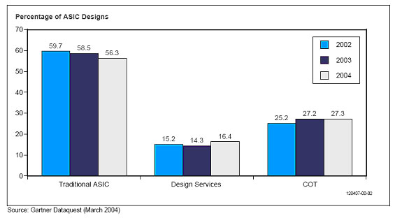 系統(tǒng)設(shè)計(jì)者們一直在研究,從ASIC模式轉(zhuǎn)移到COT模式(顧客自有工具模式)是否能夠縮減他們的設(shè)計(jì)費(fèi)用。雖然某些公司在這個(gè)轉(zhuǎn)換過(guò)程是成功的,但是其它公司認(rèn)為COT模式并不是一種好的選擇。采用這種方式,必須在設(shè)計(jì)工具和基礎(chǔ)設(shè)施方面進(jìn)行重大的前期投資,這對(duì)很多公司來(lái)說(shuō)數(shù)目太大了。那些成功的轉(zhuǎn)變成COT模式的企業(yè)通常都是做很多設(shè)計(jì)的大公司。圖二展示了根據(jù)我們的系統(tǒng)設(shè)計(jì)者調(diào)查得出的設(shè)計(jì)商業(yè)模式的概況。最新的結(jié)果表明,COT保有了一定的市場(chǎng)份額。某些系統(tǒng)設(shè)計(jì)者希望通過(guò)預(yù)先在設(shè)計(jì)室布線布局,然后送到工廠制造這種方式來(lái)優(yōu)化設(shè)計(jì)速度。為應(yīng)對(duì)這種潮流,ASIC供應(yīng)商為布局布線的速度優(yōu)化花費(fèi)了額外的時(shí)間,但是他們也因?yàn)檫@項(xiàng)新服務(wù)增加了費(fèi)用。