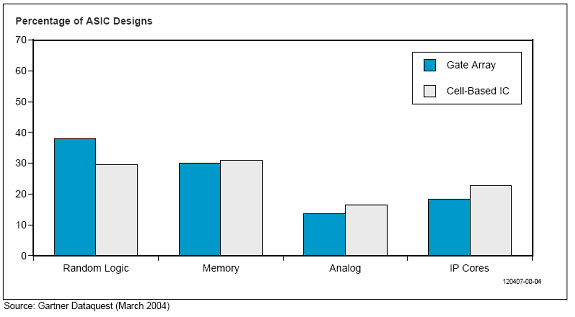 圖四比較了門陣列和基于單元的IC設(shè)計(jì)的核心組件。門陣列設(shè)計(jì)一般有更多的邏輯線路,而基于單元的IC有更多的模擬器件和嵌入式IP核。