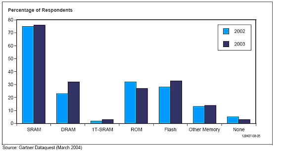 對(duì)片上存儲(chǔ)器的需求促使設(shè)計(jì)者們按照速度和密度的標(biāo)準(zhǔn)探索更多新類型存儲(chǔ)器。靜態(tài)隨機(jī)存取存儲(chǔ)器(SRAM)已經(jīng)出現(xiàn)很多年,也是目前最流行的存儲(chǔ)器類型。嵌入式動(dòng)態(tài)隨機(jī)存取存儲(chǔ)器(DRAM)在幾年前出現(xiàn),但是其在工業(yè)界沒(méi)有一個(gè)好的開(kāi)頭,因?yàn)閱纹珼RAM價(jià)格下降,因而由于這種費(fèi)用差異問(wèn)題用戶們沒(méi)能及時(shí)采用嵌入式DRAM?,F(xiàn)在嵌入式DRAM重新引起人們的興趣,并且已經(jīng)開(kāi)始在某些方面得到大批量應(yīng)用。Sony在其開(kāi)發(fā)的游戲機(jī)上的圖像處理部分引入了嵌入式DRAM,這是嵌入式DRAM ASIC最大規(guī)模應(yīng)用之一。Cisco公司在它的一型低端路由器中使用了嵌入式DRAM ASIC,而這種路由器生產(chǎn)量正在大幅度增長(zhǎng)。IBM公司為Cisco公司制造嵌入式DRAM ASIC,而且它聲稱現(xiàn)在新的0.13微米ASIC設(shè)計(jì)大約三分之一包含嵌入式DRAM。嵌入式DRAM也正在一些消費(fèi)應(yīng)用中出現(xiàn),其中包括數(shù)碼攝像機(jī)和等離子顯示器。