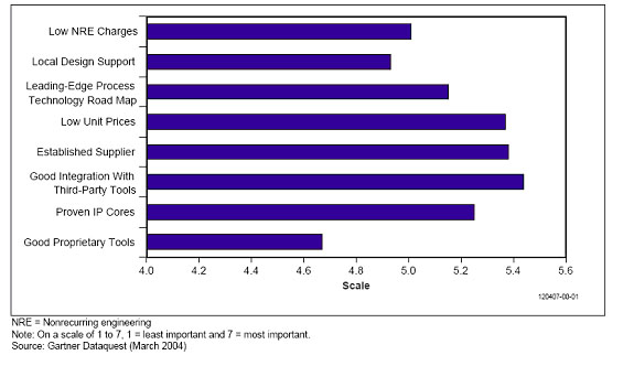 考慮到有眾多的變量和供應(yīng)商,在目前的市場(chǎng)上選擇一家ASIC供應(yīng)商需要很好的技巧。為對(duì)系統(tǒng)設(shè)計(jì)者們?nèi)绾芜x擇ASIC供應(yīng)商的問(wèn)題有一個(gè)更好的了解,Gartner Dataquest公司讓他們對(duì)選擇ASIC供應(yīng)商時(shí)考慮的各個(gè)因素進(jìn)行重要性分級(jí)。圖一顯示了調(diào)查的結(jié)果,圖中1表示最不重要,7表示最重要。