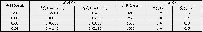 (1)、零件規(guī)格即零件的外形尺寸,SMT發(fā)展至今,業(yè)界為方便作業(yè),已經(jīng)形成了一個標(biāo)準(zhǔn)零件系列,各家零件供貨商皆是按這一標(biāo)準(zhǔn)制造。標(biāo)準(zhǔn)零件之尺寸規(guī)格有英制與公制兩種表示方法,如下表: