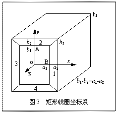 以上對(duì)一定長(zhǎng)度的帶電導(dǎo)線以及矩形環(huán)流在其四周產(chǎn)生的磁感應(yīng)強(qiáng)度進(jìn)行了分析,下面在此基礎(chǔ)上詳盡介紹矩形線圈作為激勵(lì)源產(chǎn)生的磁場(chǎng)分布。為了便于分析,對(duì)矩形線圈建立如圖3的坐標(biāo)系,由體電流源產(chǎn)生的磁感應(yīng)強(qiáng)度,可以通過(guò)下式進(jìn)行計(jì)算: