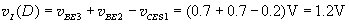 CD段:當(dāng)vI的值繼續(xù)增加并超越C點(diǎn),使T3飽和導(dǎo)通,輸出電壓迅速下降至v0≈0.2V。D點(diǎn)處的vI(D)值,可以根據(jù)T2、T3兩發(fā)射結(jié)電壓VF≈0.7V來(lái)估算。因此有