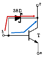 當(dāng)沒(méi)有SBD時(shí),隨著基級(jí)電壓的升高,電流沿著藍(lán)線(xiàn)方向流動(dòng)。由于SBD的作用,當(dāng)基級(jí)電壓大于0.4V時(shí), SBD首先電導(dǎo)通,電流沿著紅線(xiàn)方向流動(dòng)(如下圖所示),從而使T的基極電流不會(huì)過(guò)大(而且使T的集電結(jié)正向偏壓將被鉗制在0.4V左右),因此SBD起到抵抗過(guò)飽和的作用,因而又將這種電路稱(chēng)為抗飽和電路,使電路的開(kāi)關(guān)時(shí)間大為縮短。