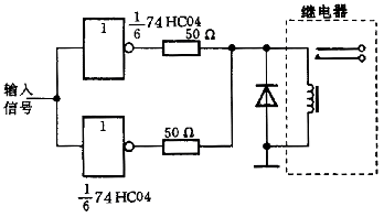 在工程實(shí)踐中,往往會遇到用各種數(shù)字電路以控制機(jī)電性系統(tǒng)的功能,如控制電動機(jī)的位置和轉(zhuǎn)速,繼電器的接通與斷開,流體系統(tǒng)中的閥門的開通和關(guān)閉,自動生產(chǎn)線中的機(jī)械手多參數(shù)控制等。下面以繼電器的接口電路為例來說明。在繼電器的應(yīng)用中,繼電器本身有額定的電壓和電流參數(shù)。一般情況下,需用運(yùn)算放大器以提升到必須的數(shù)一模電壓和電流接口值。對于小型繼電器,可以將兩個反相器并聯(lián)作為驅(qū)動電路,如下圖所示。