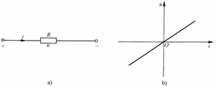 凡是端電壓與端電流成正比的電阻元件稱為線性電阻,線性電阻的表示符號如圖1-2-1(a)所示,線性電阻的伏安特性是一條過原點的直線,其斜率即為電阻值,如圖1-2-1(b)所示: