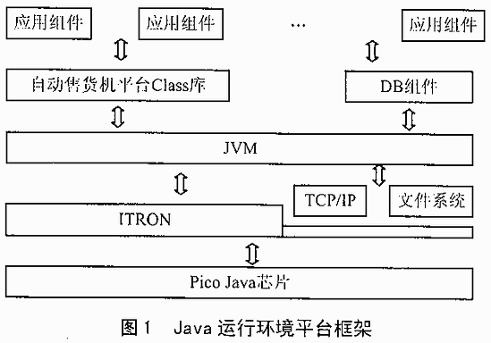 圖1所示為Java運(yùn)行環(huán)境的總體框架示意圖。本系統(tǒng)為克服Java的解釋執(zhí)行機(jī)制所引起的執(zhí)行速度慢的問題,在硬件上采用了Sun公司開發(fā)的Pico Java芯片。它能夠直接執(zhí)行Java的二進(jìn)制代碼,使Java的執(zhí)行速度提高一個數(shù)量級以上。在硬件層的上面是OS層,本系統(tǒng)采用的是ITRON(日本東京大學(xué)坂村鍵教授設(shè)計(jì)的一種嵌入式操作系統(tǒng),雖然在日本以外的市場影響不大,但在日本本地市場,占有率達(dá)90%以上)。由于ITRON規(guī)格制定得比較早,并且為兼顧低端嵌入式應(yīng)用的場合,ITRON總體上功能比較簡單,并未把諸如TCP/IP、文件系統(tǒng)等內(nèi)容包含在其里面,因此與嵌入式Linux等不一樣的是,TCP/IP、文件系統(tǒng)是以獨(dú)立的組件形式存在的。在OS層的上面是JVM層。與其它一般Java虛擬機(jī)不同的是,本系統(tǒng)的Java執(zhí)行代碼不需要由JVM解釋執(zhí)行,而是由CPU硬件直接執(zhí)行。在JVM的上層是自動售貨機(jī)的基礎(chǔ)平臺類庫和公共組件層。本文介紹的DB引擎組件正是處于這一層。該層的上面是應(yīng)用程序?qū)?,用于?shí)現(xiàn)自動售貨機(jī)的各種控制、管理機(jī)能。