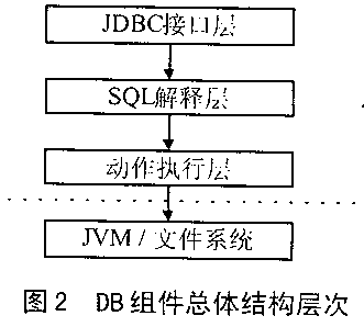如圖2所示,將整個DB組件設(shè)計(jì)為3層結(jié)構(gòu),分別為JDBC接口層、SQL解釋層和動作執(zhí)行層。這3層之間呈單向依賴關(guān)系。也就是說,SQL解釋層依賴于動作執(zhí)行層,但動作執(zhí)行層不依賴于其上面的兩層,可以單獨(dú)存在而直接被使用。如果用戶以使用方便為主要目的,可采用完全配置方式,應(yīng)用程序通過JDBC接口層存取數(shù)據(jù)。反之,如果用戶對空間和效率要求較高,可僅配置動作執(zhí)行層組件,應(yīng)用程序直接調(diào)用動作執(zhí)行層的API進(jìn)行數(shù)據(jù)的檢過和更新等操作。