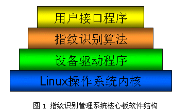如上圖所示,軟件由Linux操作系統(tǒng)內(nèi)核,設(shè)備驅(qū)動(dòng)程序,指紋識(shí)別算法以及用戶接口程序等四個(gè)部分組成。操作系統(tǒng)負(fù)責(zé)整個(gè)系統(tǒng)的管理,進(jìn)程調(diào)度等。設(shè)備驅(qū)動(dòng)用于驅(qū)動(dòng)各種外設(shè)進(jìn)行工作,例如指紋采集,串口通信等。指紋識(shí)別算法是系統(tǒng)的核心部分,算法設(shè)計(jì)的好壞直接關(guān)系到指紋識(shí)別系統(tǒng)的速度、可靠性等重要指標(biāo)。清華大學(xué)精密測(cè)試技術(shù)及儀器國(guó)家重點(diǎn)實(shí)驗(yàn)室林教授領(lǐng)導(dǎo)數(shù)名博士、碩士進(jìn)行了十余年的潛心鉆研以及眾多國(guó)家級(jí)公安、國(guó)防、人事部門的實(shí)用驗(yàn)證保證了我們這款設(shè)計(jì)中算法的先進(jìn)性和可靠性。用戶接口程序則提供核心板和用戶板之間的通信機(jī)制,使得用戶可以方便地對(duì)核心板進(jìn)行控制。