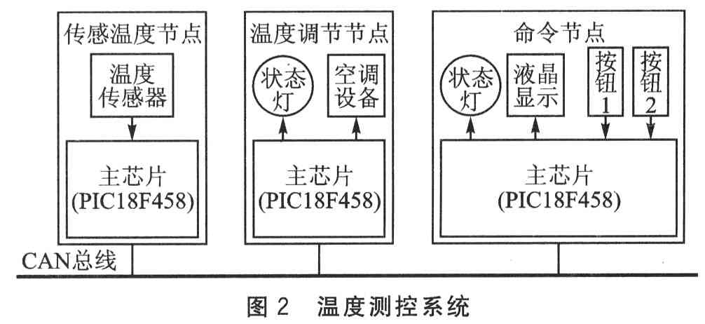 ??? 圖2所示溫度測控系統(tǒng)包含3個節(jié)點,它們構(gòu)成一個CAN網(wǎng)絡(luò)。傳感溫度節(jié)點發(fā)送測到的溫度,此節(jié)點由主芯片和溫度傳感器組成。溫度調(diào)節(jié)節(jié)點接收到從傳感溫度節(jié)點發(fā)送的溫度數(shù)據(jù)后,低于下限溫度加熱,高于上限溫度降溫,并發(fā)送調(diào)節(jié)狀態(tài);此節(jié)點由主芯片、狀態(tài)顯示燈和空調(diào)設(shè)備組成。命令節(jié)點接收從傳感溫度節(jié)點發(fā)送的溫度和溫度調(diào)節(jié)節(jié)點發(fā)送的狀態(tài)在液晶屏上顯示,并有按鈕可以發(fā)送NMT對象,對整個系統(tǒng)進行控制;此節(jié)點由主芯片、液晶屏、狀態(tài)顯示燈和按鈕組成。