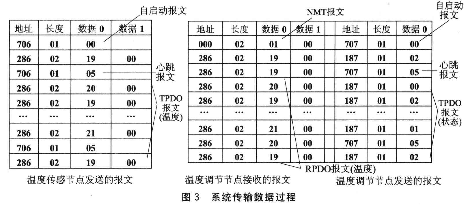 ??? 圖3為系統(tǒng)傳輸數(shù)據(jù)的過程,溫度傳感節(jié)點發(fā)送報文過程為發(fā)送自啟動報文后以周期為1 s發(fā)送心跳報文,以周期為100 ms發(fā)送PDO1報文,發(fā)送數(shù)據(jù)為傳感溫度(分別為19°,20°,…,21°…)。上限溫度和下限高溫都為20°時,溫度調(diào)節(jié)節(jié)點接收報文過程為接收到NMT報文命令后進入操作狀態(tài),不斷接收PDOl報文。溫度調(diào)節(jié)節(jié)點發(fā)送報文過程為發(fā)送自啟動報文后以周期為1 s發(fā)送心跳報文,以事件觸發(fā)方式發(fā)送PDOO報文(發(fā)送數(shù)據(jù)為工作狀態(tài)長度為1,當接收到的溫度低于20°時發(fā)送數(shù)據(jù)為02表示加熱,當接收到的溫度高于20°時發(fā)送數(shù)據(jù)為01表示降溫,當接收的溫度為20°時發(fā)送數(shù)據(jù)為OO表示保持),狀態(tài)顯示燈不斷閃爍紅色、黃色、藍色。如在命令節(jié)點中發(fā)送SDO報文改變對象字典中的上限溫度和下限溫度,再觀察各節(jié)點變化。情況1,當上限溫度低于20°(為15°)時,溫度調(diào)節(jié)節(jié)點一直在降溫狀態(tài),狀態(tài)顯示燈為紅色。情況2,當下限溫度高于20°(為25°)時,溫度調(diào)節(jié)節(jié)點一直在加熱狀態(tài),狀態(tài)顯示燈為黃色,情況3,當上限溫度高于20°(為25°),下限溫度低于20°(為15°)時,溫度調(diào)節(jié)節(jié)點一直在保持狀態(tài),狀態(tài)顯示燈為藍色。命令節(jié)點在液晶顯示屏中顯示實時溫度,在狀態(tài)顯示燈中顯示實時狀態(tài)。