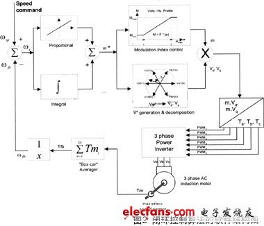 馬達(dá)驅(qū)動(dòng)裝置共有三大軟件模塊:變速操作所需的閉環(huán)空間向量脈寬調(diào)制(SVPWM)模塊、前端輸入功率因數(shù)校正,以及一個(gè)主要做為控制器與用戶控制面板之間界面的通信模塊。本文著重介紹了SVPWM模塊??臻g向量PWM技術(shù)具有多項(xiàng)優(yōu)點(diǎn),從而勝過(guò)正弦波PWM等較簡(jiǎn)單、效率較差的方法。在特定的直流鏈路電壓輸出下,SVPWM的三相馬達(dá)功率輸出比正弦波PWM饋電馬達(dá)的高出16%。圖2是SVPWM算法的結(jié)構(gòu)圖。