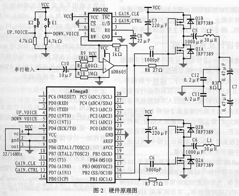 功率放大部分采用兩片IRF7389,每一片中內(nèi)置一對VMOS管,N溝道和P溝道的導(dǎo)通電阻分別為46、98mΩ?VGS=4.5V時(shí)?,最大輸出功率為30W。此外,IRF7389還內(nèi)置高速恢復(fù)二極管,能降低諧波失真。圖2中的C17 、C16是加速電容,可用來改善激勵波形,以使VMOS管迅速由截止轉(zhuǎn)換為導(dǎo)通,或由導(dǎo)通迅速轉(zhuǎn)為截止,以達(dá)到減少死區(qū)時(shí)間,改善輸出波形之目的。圖2中的 R7、R8主要起保護(hù)作用。