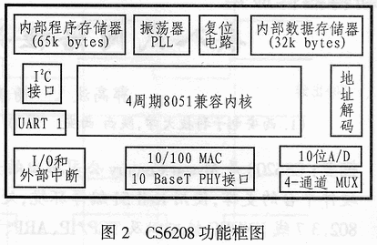 摘要:CS6208是Myson Century公司推出的專門用于網(wǎng)絡(luò)控制和傳輸?shù)男酒?,它基?051體系結(jié)構(gòu)硬件平臺的支撐,使用Keil 51編譯環(huán)境,處理速度與8051系列單片機(jī)相比有很大的提高,支持IEEE 802.37線ENDEC接口以及TCP/IP、ARP、UDP等協(xié)議,并且集成有4周期的8051和一個以太網(wǎng)接口。由于它把TCP/IP協(xié)議棧函數(shù)已封裝起來,因此,用戶只需調(diào)用它的API函數(shù)即可完成操作。文章介紹了CS6208的原理、特點和引腳功能,給出了CS6208的一種典型應(yīng)用設(shè)計電路。