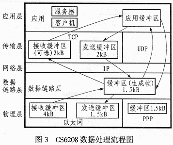 CS6208物理層支持以太網(wǎng)接口和RS232串口的點到點協(xié)議。在CS6208中,每一個以太網(wǎng)的發(fā)送緩沖區(qū)是1.5k字節(jié),其接收緩沖區(qū)也經(jīng)常使用的,因為數(shù)據(jù)有時是以猝發(fā)形式收到的,因此,當(dāng)收到數(shù)據(jù)時,就把收到的數(shù)據(jù)放到這個緩沖區(qū)中,然后由數(shù)據(jù)鏈路層直接從該緩沖區(qū)取走數(shù)據(jù)。鏈路層通常包括操作系統(tǒng)中的設(shè)備驅(qū)動程序和計算機(jī)中對應(yīng)的網(wǎng)絡(luò)接口卡,它們將一起處理與電纜的物理接口細(xì)節(jié)數(shù)據(jù),其緩沖區(qū)可用來暫時存儲要發(fā)送或接收的數(shù)據(jù)幀。網(wǎng)絡(luò)層則處理分組在網(wǎng)絡(luò)中的活動,比如分組的選路等。傳輸層可為兩臺主機(jī)的應(yīng)用程序提供端到端的通信。在TCP/IP協(xié)議族中有兩個互不相同的協(xié)議TCP和UDP;其中TCP為兩臺主機(jī)提供可靠的數(shù)據(jù)通信,而UDP則提供一種簡單的服務(wù)。對于TCP發(fā)送過程而言,應(yīng)用程序把數(shù)據(jù)先寫到緩沖區(qū)中,再寫到TCP的發(fā)送緩沖區(qū),然后寫到數(shù)據(jù)鏈路層的緩沖區(qū),最后再通過以太網(wǎng)發(fā)送緩沖區(qū)到網(wǎng)絡(luò)上。TCP的接收數(shù)據(jù)過程與此類似,每一個TCP套節(jié)字的接收緩沖區(qū)是可選的,如果應(yīng)用程序要使用這個接收緩沖區(qū),那么傳輸過來的數(shù)據(jù)就先寫到這個緩沖區(qū)中,之后再從這里取走,如果沒有這個接收緩沖區(qū),接收來的數(shù)據(jù)就會直接送給應(yīng)用程序。在這種情況下,對于UDP來說,其過程還相對簡單,應(yīng)用程序只要把緩沖區(qū)中的數(shù)據(jù)送到數(shù)據(jù)鏈路層緩沖區(qū)中,然后通過以太網(wǎng)發(fā)出去即可,而應(yīng)用層則要負(fù)責(zé)處理特定的應(yīng)用程序細(xì)節(jié),這就要求每一個應(yīng)用程序都有自己的緩沖區(qū),這在一些標(biāo)準(zhǔn)的TCP應(yīng)用程序(如POP3、SMTP、HTTP、FTP)中是很常見的。具體的數(shù)據(jù)處理過程見圖3所示,圖中箭頭所指是數(shù)據(jù)的流向。