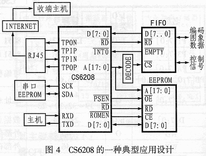 CS6208特別適用于網(wǎng)絡(luò)傳輸,尤其是在接入到Internet時,可以非常方便地用于社區(qū)安全管理、監(jiān)控、家居安全、小型儀器設(shè)備的網(wǎng)絡(luò)化升級和信息家電等。原來需要專門工具、軟件,且需花費很長的研發(fā)時間才能實現(xiàn)的遠(yuǎn)程管理和控制,現(xiàn)在使用普通IE或者NetScape等常用瀏覽器軟件,通過Internet即可實現(xiàn)遠(yuǎn)程訪問和控制,因而是信息家電等設(shè)備In-ternet化升級換代的有力工具。它的處理速度能夠達(dá)到一般網(wǎng)絡(luò)接入的要求,由于CS6208支持ARP、ICMP、IP、UDP、TCP、DNS、DHCP、HTTP等常用協(xié)議,且應(yīng)用技術(shù)門檻極低,因而無需用戶自己開發(fā)TCP/IP等核心軟件,特別適合傳統(tǒng)行業(yè)的產(chǎn)品改造和升級;同時它也可以實現(xiàn)RS232到以太網(wǎng)口的傳輸,以使數(shù)據(jù)輕松接入網(wǎng)絡(luò)。CS6208的外部數(shù)據(jù)輸入端可以是SRAM或者FIFO接口,數(shù)據(jù)經(jīng)處理后直接發(fā)送至局域網(wǎng)或者連接到Internet用戶,而且CS6208的雙向通用串口和兩個I2C總線接口可以方便地擴(kuò)展使用。圖4是筆者用CS6208設(shè)計的網(wǎng)絡(luò)攝像機(jī)系統(tǒng)的網(wǎng)絡(luò)收發(fā)服務(wù)器子系統(tǒng)(圖像壓縮模塊圖中未畫)。在該系統(tǒng)中,CS6208作為服務(wù)器,壓縮系統(tǒng)模塊不斷地把圖像數(shù)據(jù)寫到FIFO中,CS6208則不斷從FIFO中讀取數(shù)據(jù)并進(jìn)行處理,然后通過網(wǎng)絡(luò)發(fā)送到局域網(wǎng)或因特網(wǎng)上。圖中的EEPROM是用來存儲CS6208程序的,串口EEPROM通過I2C總線來配置服務(wù)器的IP地址、MAC地址、子網(wǎng)掩碼、網(wǎng)關(guān)等信息,主機(jī)可以選擇直接通過左側(cè)串口對CS6208服務(wù)器進(jìn)行控制,從而大大方便用戶的使用。實際使用證明:該系統(tǒng)工作非常穩(wěn)定可靠,具有較高的數(shù)據(jù)吞吐量。
