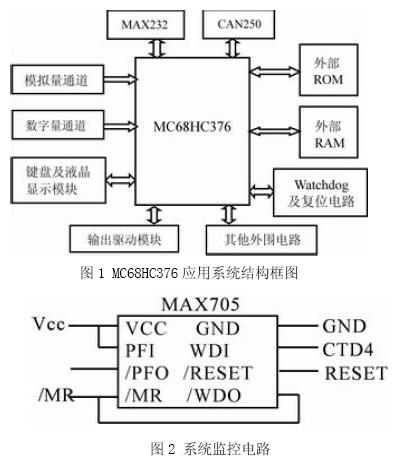 系統(tǒng)擴展的基本結構 MC68HC376 內部集成度較高,因而其所需的外圍擴展工作較少?;窘Y構包括外部Flash ROM、RAM、模擬量輸入通道、數(shù)字量輸入通道、鍵盤、液晶顯示、RS-232電平轉換器MAX232和CAN控制器CAN250等,其結構框圖如圖1所示。本文重點討論系統(tǒng)的可靠性設計。