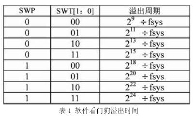 看門狗的溢出時間由系統(tǒng)頻率以及SYPCR寄存器的看門狗分頻位(SWP)和看門狗定時區(qū)(SWT[1:0])決定,如表1所示。選擇看門狗溢出時間時應該注意大小適中,若取值過大,則程序可能會較長時間處于死循環(huán)或跳飛狀態(tài),從而導致控制錯誤或失效;若取值過小,則會增加程序負擔,降低裝置運行效率。