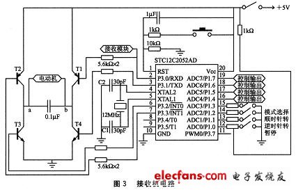 圖3中,與單片機(jī)左邊相連的部分為電動(dòng)機(jī)驅(qū)動(dòng)電路。該電路由2對(duì)晶體管組成一個(gè)橋式互補(bǔ)對(duì)稱電路,其中包含了電動(dòng)機(jī)。電動(dòng)機(jī)是一種將電脈沖信號(hào)轉(zhuǎn)換成階躍型的角位移或者直線位移的變換器,它的旋轉(zhuǎn)是以固定的角度(步距角)運(yùn)行的。當(dāng)4個(gè)晶體管均為低電平時(shí)(由芯片控制),這4個(gè)晶體管的集電極和發(fā)射極均不能導(dǎo)通,此時(shí)電動(dòng)機(jī)a端和b端均為O V,電動(dòng)機(jī)不能轉(zhuǎn)動(dòng)。當(dāng)P3.0和P3.2為高電平,P3.1和P3.3為低電平時(shí),晶體管T1和T3均導(dǎo)通,此時(shí)a端得到高電平,而b端與地相通,電動(dòng)機(jī)開始轉(zhuǎn)動(dòng)。除去晶體管T1和T3的壓降,電動(dòng)機(jī)的兩端大概可以得到4.5 V的電壓。同樣道理,當(dāng)P3.1和P3.3為高電平,P3.O和P3.2為低電平時(shí),b端得到高電平,而a端與地相通,電動(dòng)機(jī)反轉(zhuǎn)。通過該橋式電路,控制P3.O和P3.2、P3.1和P3.3端口的電平(注意:這4個(gè)端口不能全部為高電平)便可以實(shí)現(xiàn)電動(dòng)機(jī)的正轉(zhuǎn)、反轉(zhuǎn)和停轉(zhuǎn),即實(shí)現(xiàn)了模型的前進(jìn)或后退。為了消除電動(dòng)機(jī)的電弧干擾,應(yīng)在電動(dòng)機(jī)兩側(cè)加一個(gè)小電容,其值為0.1μF。