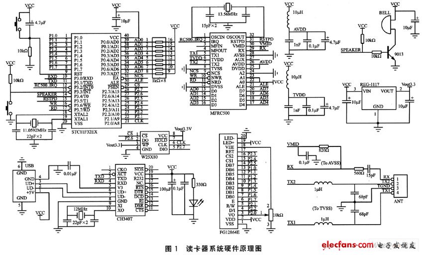 圖為IC卡讀卡器原理電路圖。其中讀寫器由單片機(jī)、鍵盤
