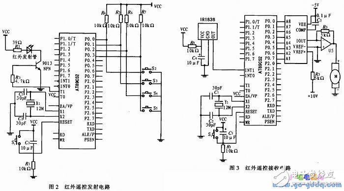 設(shè)計(jì) 如圖2所示,該圖為紅外遙控發(fā)射電路圖?! ↑c(diǎn)擊此處查看全部新聞圖片 在圖2中,單片機(jī)采用AT89C52,這是遙控電路的主芯片。ATMEL公司生產(chǎn)的AT89C52單片機(jī)采用高性能的靜態(tài)
