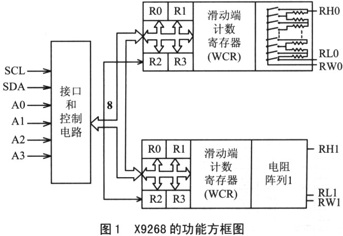 X9268的工作原理 X9268支持雙向的定向規(guī)約,是一個(gè)從屬器件。它的高四位地址為0101,即為器件的類型辨識(shí)符,低四位地址由A3~AO