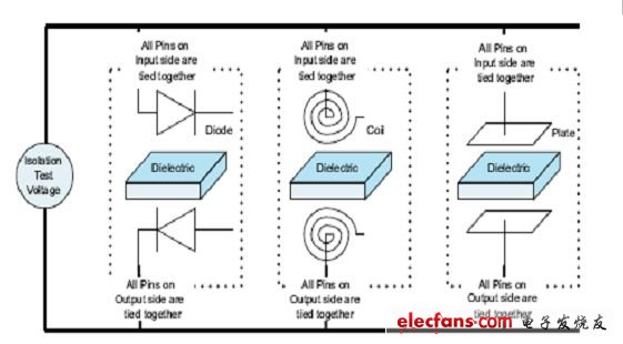 三個主要標準驗證了對于隔離保護的必要性,其分別為UL 1577、IEC 60747-5-2和CSA。雖然每一種標準都稍有不同,但是均提供了一個對比隔離性能的標準。IEC、UL和CSA的測試證實了輸入和輸出之間電介質(zhì)擊穿以外的電壓。運用這些標準非常簡單,因為測試標準和隔離方法無關。圖10顯示了隔離測試是如何將隔離器看作是兩端器件的。盡管每種器件的物理結構存在差異,但隔離測試卻是在電介質(zhì)擊穿電壓上測定的。