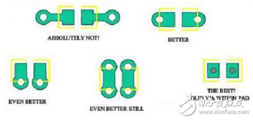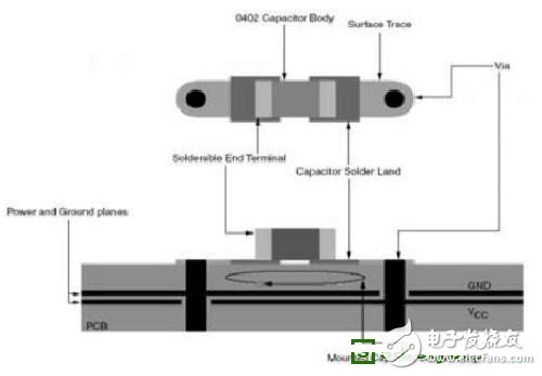 電源線必須為交流地,最大程度減小交流地回路的寄生電感非常重要。元件布局或擺放方向可能會引起寄生電感,例如去耦電容的地方向。旁路電容有兩種擺放方法,分別如圖所示:這種配置下,將頂層上的VCC焊盤連接至內(nèi)層