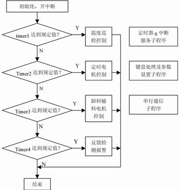 將定時(shí)器0設(shè)置成定時(shí)方式,每0.5s中斷一次,每中斷一次,變量timer1、timer2、timer3和timer4增加1。當(dāng)timer1、timer2、timer3和timer4達(dá)到各自的規(guī)定值時(shí),分別調(diào)用溫度巡檢控制、定時(shí)電機(jī)控制、順序運(yùn)行電機(jī)控制和電機(jī)反饋檢測報(bào)警子程序。程序流程圖如圖4所示。