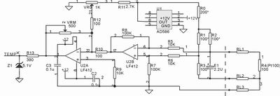 本系統(tǒng)采用Pt100熱電阻作為溫度傳感器,但必須注意以下兩點(diǎn):1、溫度接入點(diǎn)往往與控制系統(tǒng)有一定的距離,必須對導(dǎo)線電阻的影響進(jìn)行補(bǔ)償,否則會引起很大的誤差,嚴(yán)重時(shí)甚至無法測試;2、電源波動的影響。因?yàn)橄到y(tǒng)電源一般有50mV的波動,這一波動范圍與阻值變化引起的電壓變化幅度相比不可忽視。