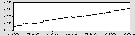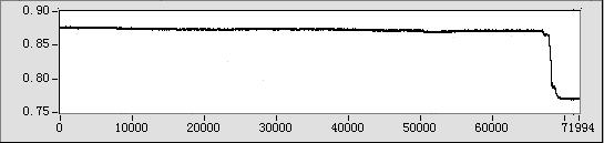 首先,因?yàn)椴煌瑮l件(管徑、溫度、壓力、輸送工藝、環(huán)境噪聲等)下的信號(hào)具有不同的特征,我們利用LabVIEW中豐富的信號(hào)處理函數(shù)對(duì)信號(hào)的特征作了深入的研究分析和預(yù)處理,使得系統(tǒng)能夠針對(duì)不同的信號(hào)做出相應(yīng)的處理。例如,在滄州首站,啟泵的時(shí)候信號(hào)中含有比較有規(guī)律的尖銳噪聲,雖然幅度并不大(只有約千分之一兆帕),卻因?yàn)閴毫Ρ容^低而非常明顯,如圖3。針對(duì)這樣的情況,我們使用了中值濾波器。中值濾波器能夠平滑尖銳噪聲,又能保持信號(hào)的邊沿,而且計(jì)算速度非常快,可以用于在線處理。對(duì)比下面兩圖,可以看到濾波的效果。