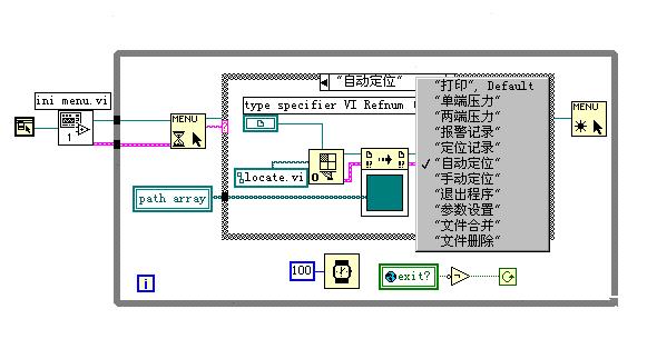 用戶對(duì)系統(tǒng)的操作都設(shè)計(jì)為菜單操作,包括參數(shù)設(shè)置、文件處理、歷史數(shù)據(jù)、泄漏定位和退出系統(tǒng)等幾項(xiàng)。每一項(xiàng)菜單還有報(bào)警、都通過(guò)VI Server的方法動(dòng)態(tài)調(diào)用,這樣既節(jié)省內(nèi)存,又使程序結(jié)構(gòu)清晰,模塊化好。