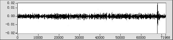 對(duì)信號(hào)作了一定預(yù)處理之后,我們采用Signal Processing軟件包里提供的小波分析的動(dòng)態(tài)庫(kù)來(lái)捕捉壓力波變化的特征點(diǎn)。將含有負(fù)壓波信號(hào)的數(shù)據(jù)通過(guò)兩通道濾波器,分為低頻概貌和高頻細(xì)節(jié)兩路輸出,負(fù)壓波的位置就是高頻細(xì)節(jié)當(dāng)中最小值對(duì)應(yīng)的索引值。圖5為圖2所示信號(hào)的高頻結(jié)果。因?yàn)槲覀儍H分析信號(hào),不作重構(gòu),所選擇參數(shù)設(shè)計(jì)更為靈活的雙正交的濾波器組,而不必考慮對(duì)偶濾波器組是否收斂。利用Wavelet and Filter Bank Design Tookit提供的Design Panel 和1D Test Panel,我們?cè)诂F(xiàn)場(chǎng)對(duì)于不同的信號(hào)可以方便地調(diào)整濾波器參數(shù),觀察濾波效果,大大提高了應(yīng)用的效率。
