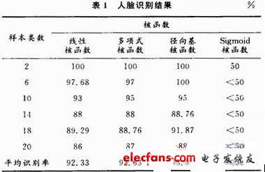 人臉識別屬于非線性問題,根據(jù)模式識別的理論,總可以將低維空間非線性可分得問題映射到高維空間,使其在高位空間線性可分。從而把非線性可分的問題轉(zhuǎn)化為線性可分問題。利用核函數(shù)K(xi,x)可將輸入向量x映射到高位空間進(jìn)行分類,此時(shí)最優(yōu)分類超平面的決策函數(shù)式變?yōu)椋?/p>