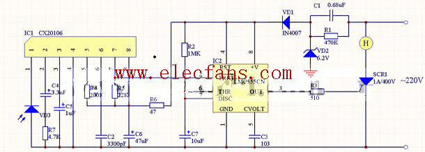 電路原理: 電路由紅外接收器、單穩(wěn)態(tài)延時電路和可控硅電路組成,如圖,紅外接收器電路由CX20160A 及光電二極管VD組成。在該電路中,IC的中心頻率已被帶通濾波器中心頻率設(shè)置電阻R設(shè)置為f0=40khz,這對于大多數(shù)紅外遙控發(fā)射器基本都適用。當(dāng)光電二極管VD接收到來自發(fā)射器的發(fā)射信號后,IC的輸出端7腳輸出低電平。單穩(wěn)態(tài)延時電路中,由555電路與RP、C組成脈沖啟動式單穩(wěn)態(tài)觸發(fā)器,由負(fù)脈沖或低電平通過2腳觸發(fā),使其翻轉(zhuǎn)。平時,由于IC的7腳輸出高電平,IC的3腳輸出低電平。當(dāng)IC的7腳輸出低電平時,通過2腳使IC2翻轉(zhuǎn),3腳變?yōu)楦唠娖?。這一高電平通過R將可控硅VS觸發(fā),使其導(dǎo)通,電燈亮。單穩(wěn)態(tài)電路被觸發(fā)翻轉(zhuǎn)后進入暫穩(wěn)態(tài),這時電源通過RP向C充電,C充電所需的時間便是單穩(wěn)態(tài)觸發(fā)器的延時時間,這個時間TD=1.1RPC5。由于采用了可調(diào)電阻RP,單穩(wěn)態(tài)電路的暫穩(wěn)時間可根據(jù)需要進行調(diào)整。當(dāng)C5充電使其正端電壓升至2VDD/3時,單穩(wěn)態(tài)電路翻轉(zhuǎn),IC的3腳恢復(fù)低電平,雙向可控硅VS關(guān)斷,電燈熄滅。 元件的選擇與制作: VD2應(yīng)該用6.2V的穩(wěn)壓二極管,SCR1采用1A/400V的單向可控硅或雙向可控硅,其它元件無特殊要求。 安裝與調(diào)試: 元件安裝: 電阻、可調(diào)電阻、電容、MIC、三極管、電感L、IC 調(diào)試方法: 元器件安裝無誤后,通電進行調(diào)試。調(diào)試主要分兩部分,一是由555構(gòu)成的單穩(wěn)態(tài)延時電路。通電調(diào)試先測量IC555第4、8腳與1腳之間的電壓值應(yīng)該為6V,電壓有變時,應(yīng)檢查VD1、VD2、C1、R1,重點檢查VD2有沒有損壞,在檢查這部分電路時要特別小心,要不你會給220V的交流電給電倒。調(diào)試555單穩(wěn)態(tài)延時電路時,用表筆碰接一下IC2的第2腳,這時電燈H就會點亮。如果不工作,檢查IC2的電路是否有錯誤,其中R2、C7的數(shù)值決定延時時間的長短。 第二部分是IC1 CX20106構(gòu)成的紅外接收電路。紅外信號從IC1第1腳輸入,由第7腳輸出。其中R4為帶通濾波器中心頻率的設(shè)置電阻,通過改變其阻值可以改變接收器的接收頻率。C4、R7是決定放大增益,IC1的總增益被設(shè)計為77"79dB,在此增益下IC1第7腳輸出的脈沖幅度約為3.5"5V。C2為積分電容,其容量一般取330PF。C2較大時,雖然可使抗干擾能力提高,但同時會使輸出脈沖的低電平持續(xù)時間加長,造成遙控距離變短。