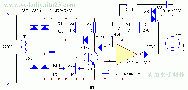 電路原理見(jiàn)圖1。當(dāng)220V市電電網(wǎng)電壓過(guò)低時(shí),可能損壞電冰箱電機(jī)時(shí),R1和RP1分壓值減小,使VD5導(dǎo)通,使集成電路IC導(dǎo)通,接著使VD7截止,隨之雙向可控硅VS關(guān)斷,從