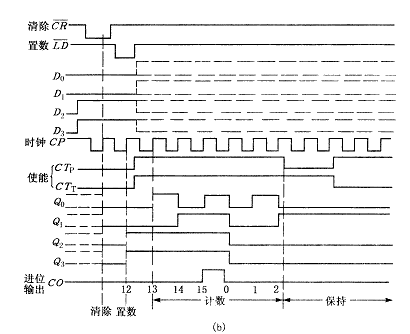 ???計數(shù)器選用集成電路74LS163進行設計較簡便。74LS163是4位二進制同步計數(shù)器,它具有同步清零、同步置數(shù)的功能。74LS163的外引線排列圖和時序波形圖如圖12、3所示,其功能表如表12、2所示。圖中, 是低電平有效的同步清零輸入端, 是低電平有效才同步并行置數(shù)控制端,CTp、CTT是計 圖12、2 交通燈的ASM圖數(shù)控制端,CO是進位輸出端,D0~D3是并行數(shù)據(jù)輸入端,Q0~Q 3是數(shù)據(jù)輸出端。由兩片74LS163級聯(lián)組成的定時器電路如圖12、4所示。電路的工作原理請自行分析。