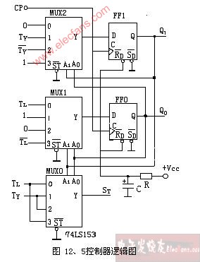 ????根據(jù)以上方程,選用數(shù)據(jù)選擇器 74LS153來實現(xiàn)每個D觸發(fā)器的輸入函數(shù),將觸發(fā)器的現(xiàn)態(tài)值( )加到74LS153的數(shù)據(jù)選擇輸入端作為控制信號.即可實現(xiàn)控制器的功能??刂破鞯倪壿媹D如圖12、5所示。圖中R、C構成上電復位電路 。