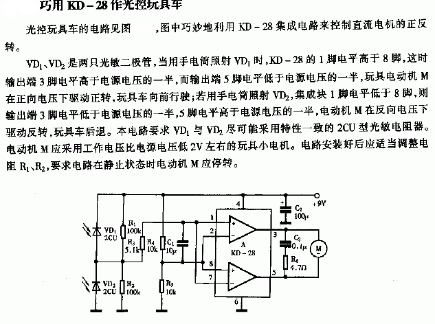 這款電子玩具車,在收到光信號(如手電筒光亮)后,直線向前行駛,并伴有雙色發(fā)光二極管紅、綠二色交替閃光,1分鐘后自動停止。