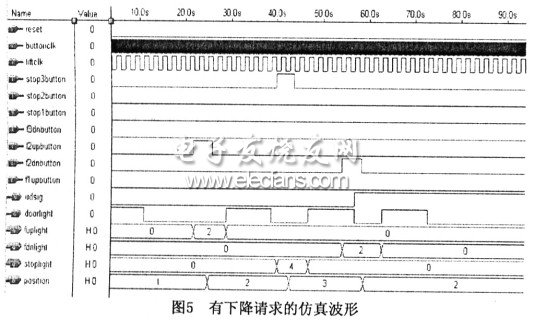 模塊(二):圖5是有下降請(qǐng)求的情況,它是圖4的繼續(xù),當(dāng)電梯停留在第三層的時(shí)候,在電梯外第二層有下降請(qǐng)求,這時(shí)候fdnlight信號(hào)燈由0變?yōu)?,說明第二層有下降請(qǐng)求。電梯下降到第二層,響應(yīng)了下降請(qǐng)求,所以fdnlight信號(hào)燈清0。這時(shí)候,在電梯內(nèi)部沒有停留在哪層的請(qǐng)求,所以電梯就停留在第二層,position信號(hào)的值保持在2。