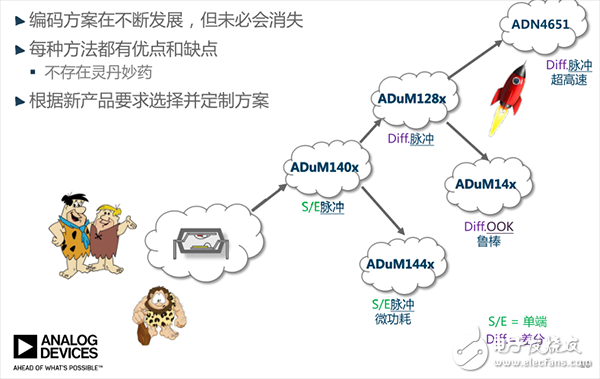 隔離器。人們也可以看到,不同的技術在邊界上也占據不同的位置,變壓器/聚酰亞胺數字隔離器采用脈沖編碼方法,功率效率低得多,開關鍵控方法顯示出更好的時序性能。這個圖表隱藏著不同數字隔離器廠商如何在這個邊界