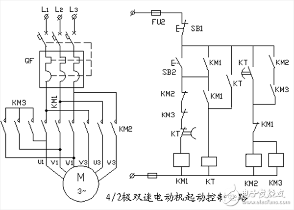 4/2極雙速電動機(jī)起動控制電路工作原理:
