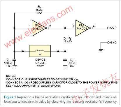 LCπ網(wǎng)絡(luò)形成了一個(gè)平行共振,共振的頻率為 fO=1/2π。這個(gè)頻率對(duì)應(yīng)在CS=C1||C2=50 nF這個(gè)時(shí)期。所以你可以通過測(cè)量共振頻率fO計(jì)算出電感LX。在共振頻率期間,LCπ網(wǎng)絡(luò)提供一個(gè)從輸入到輸出的180 °相移。振蕩器周圍振蕩回路fO的相移必須為360 °,并且震蕩回路的增益必須大于一。這樣才能產(chǎn)生震蕩。逆變器IC1A提供了一個(gè)額外的從輸入到輸出的180 °相移和一個(gè)高增益來補(bǔ)償衰減網(wǎng)絡(luò)。
