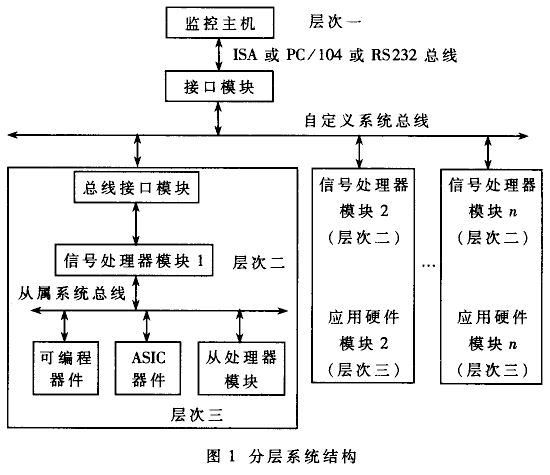 根據(jù)以上思路,系統(tǒng)宜采用分層式結(jié)構(gòu),如圖1所示。其中,自定義系統(tǒng)總線(類似于GPIB總線)及接口模塊實現(xiàn)主機(層次一)對多個信號處理模塊(層次二、三)的監(jiān)控,基于16位ISA并行接口的設(shè)計細節(jié)參見參考文獻[2]。對于監(jiān)控主機,在通過了調(diào)試階段后,可以用單片機替代之以進一步減小體積重量,降低成本。在信號處理器模塊中,DSP芯片及其RAM與EPROM組成的最小系統(tǒng)構(gòu)成第二層次,其硬件/軟件都具有通用性。真正與具體產(chǎn)品特定功能有關(guān)的是第三層次,它是由CPLD、ASIC芯片或級聯(lián)工作的從處理器構(gòu)成的應(yīng)用硬件模塊。隨著軟件無線電技術(shù)與器件的發(fā)展,非通用性功能越來越趨向.于用軟件實現(xiàn),而應(yīng)用硬件模塊則主要是高速CPLD、偏速模/數(shù)轉(zhuǎn)換器及數(shù)/模轉(zhuǎn)換器。因此第三層次也具有一定的通用性。