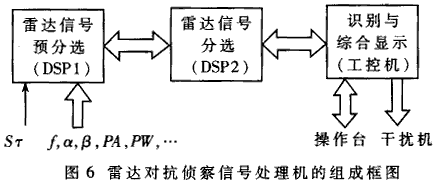 雷達對抗偵察的任務(wù)是偵收并分析敵方雷達信號,為干擾或火力摧毀敵方雷達提供情報。為此研制了基于多CPU級聯(lián)工作的信號處理分機,如圖6所示。它包括:雷達信號預分選模塊、分選處理模塊、識別與綜合顯示模塊。在預分選模塊中,由第一個DSP對來自參數(shù)測量分機的高速雷達視頻脈沖串進行稀釋與粗略分類(按頻率分),并把脈沖描述字(包括頻率f、方位、脈幅PA、脈寬PW、到達時間TOA等)通過雙口RAM傳遞給第二個DSP進行分選處理,以分離各部雷達的脈沖信號,從而測得各自技術(shù)參數(shù)。工控機獲得測量參數(shù)后與雷達情報數(shù)據(jù)庫比對,以識別敵方雷達類型、用途與威脅等級,為指揮決策提供依據(jù)。按處理速度、傳輸速度、存儲容量優(yōu)化配置流水線上各級CPU的任務(wù),可使整個系統(tǒng)達到最大處理能力。試驗表明其速度已符合實戰(zhàn)要求。