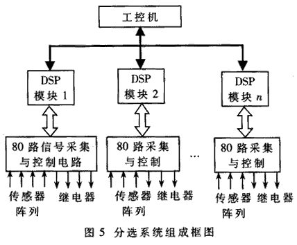 為了適應(yīng)市場需要,對材料(如糧食、礦物等)進行質(zhì)量檢測與分選有著重要意義。分選是利用不同質(zhì)量材料的重量、顏色、尺寸等物理特性不同的原理進行的。根據(jù)該原理,本實驗室開發(fā)研制了基于多DSP的材料分選控制系統(tǒng)。國內(nèi)早期的分選系統(tǒng)智能部件都采用MCS-51系列的單片機,其控制功能基本可以滿足需要,但是它的計算精度和工作速度卻遠遠不夠,因此系統(tǒng)的分選精度等指標很難做高。本文所研制的新型分選系統(tǒng)采用高速浮點運算DSP芯片TMS320VC33完成多通道信號采集和分選的控制,使得分選精度和工作速度都得到了大幅度提高。每個DSP可以勝任80路5kHz帶寬的傳感器信號的分析處理,每臺工控機最多可管理16個DSP模塊的并行工作,因而總的分選速度是非??斓摹7诌x系統(tǒng)組成框圖如圖5所示。