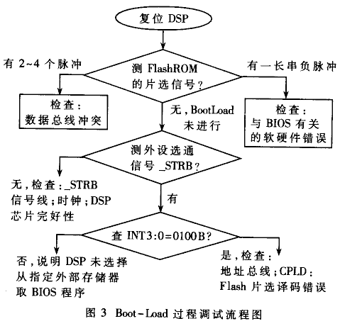 · 把DSP-BIOS軟件燒寫入Flash-ROM,調(diào)試確認DSP的Boot-Load過程。若BIOS程序未正常運行,可按流程圖3來調(diào)試。
