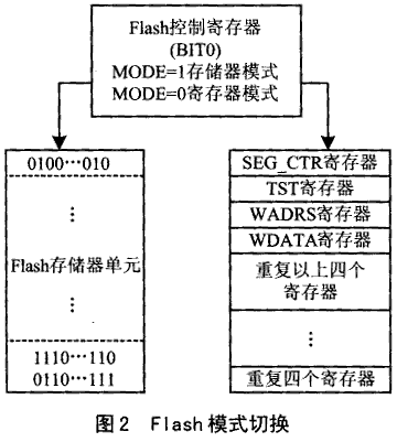Flash的“在線”編程由清“0”、置“1”和數(shù)據(jù)寫(xiě)入等操作組成。進(jìn)行這些操作前首先要將Flash由存儲(chǔ)器工作模式(mode 1)切換至于寄存器工作模式(mode 0)。F206中Flash存儲(chǔ)器工作模式由映射于I/O地址中的兩個(gè)寄存器控制,分別為F_ACCESS0寄存器(FFE0h)和F_ACCESS1寄存器(FFE1h)。向Flash模式控制寄存器的最低位寫(xiě)入0,則Flash工作于寄存器模式;反之寫(xiě)入1,則工作于存儲(chǔ)器模式。復(fù)位后,自動(dòng)處于存儲(chǔ)器模式。如圖2所示,兩種工作模式之間切換后,F(xiàn)lash內(nèi)容變化。處于模式1時(shí),F(xiàn)lash存儲(chǔ)器顯示的是其所存儲(chǔ)的數(shù)據(jù);處于模式0時(shí),F(xiàn)lash存儲(chǔ)器顯示寄存器的內(nèi)容,并且以4個(gè)為一組重復(fù)顯示于整個(gè)Flash塊中。
