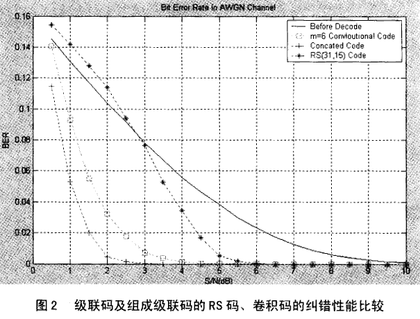 我們選用的外碼為RS(31,15)碼,生成多項式為G(X)=1+x2+x3,內(nèi)碼用卷積碼(2,1,7),其生成多項式G0=171,G1=131(都是八進制)。RS碼是GF(q)(q!=2)上,碼長N=q-1的本原BCH碼,具有很強的糾錯能力,其最大可能的最小距離是校驗元的個數(shù)加1,因而RS碼是一種極大最小距離可分碼(MDS),是一種最佳的線性循環(huán)碼。本例中使用的RS(31,15)碼的漢明距為17,可以糾8個錯誤。交織技術(shù)是抗突發(fā)干擾的重要手段,它是采用一個交織矩陣,存儲方向與發(fā)送時的方向不一樣,從而將突發(fā)錯誤離散化,提高抗突發(fā)干擾的能力。本方案中RS編碼按行存儲,發(fā)送時按列,并且對每列都進行卷積編碼,可以抵抗8×列長的突發(fā)干擾。卷積編碼Viterbi軟判決解碼,可以充分的利用各個碼組之間的相關(guān)性,提高很高的編碼增益。各個組成碼和級聯(lián)后的糾錯性能仿真圖如圖2所示。